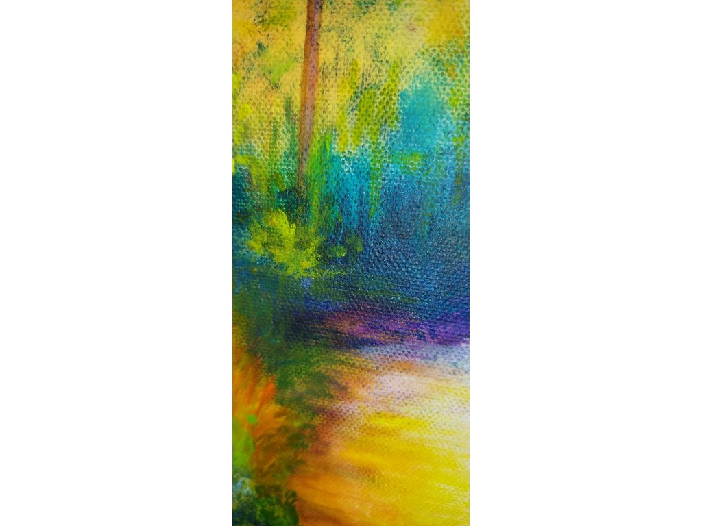 Stezka uprostřed září zlatem a růžovým klidem, jako by spojovala dvě části jedné duše. Na levé straně vládne hřejivé slunce,