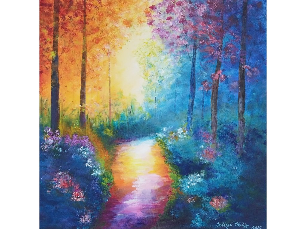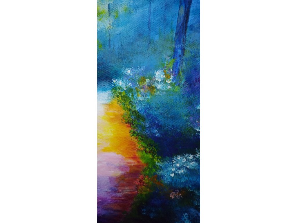 Obraz nese název Barvy lesa, malovaný akrylovými barvami, velikost 50x50 cm. 3D rám
