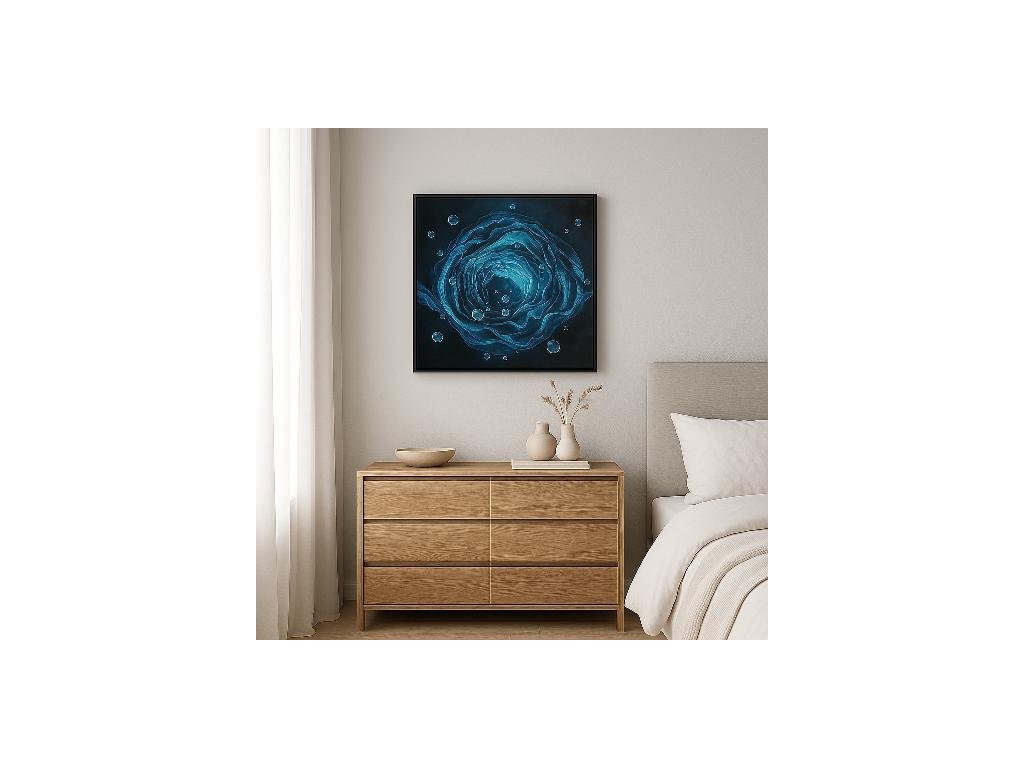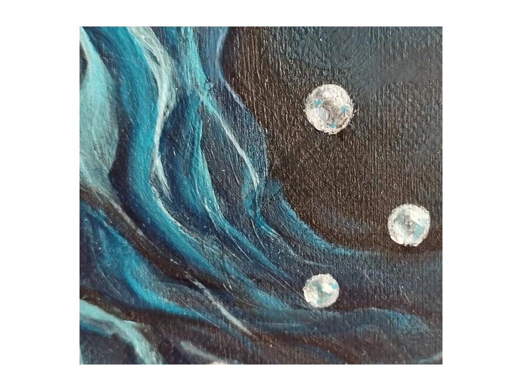 V tomto obraze se setkává hloubka s lehkostí. Závoje modrých a tyrkysových odstínů se vlní jako energie, která proudí z nitra ven nebo naopak .