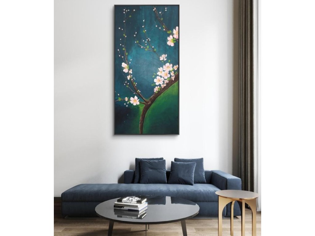 Růžové květy rozkvétající na větvích v kontrastu s hlubokým modrozeleným pozadím vytvářejí dojem ticha, lehkosti a naděje.