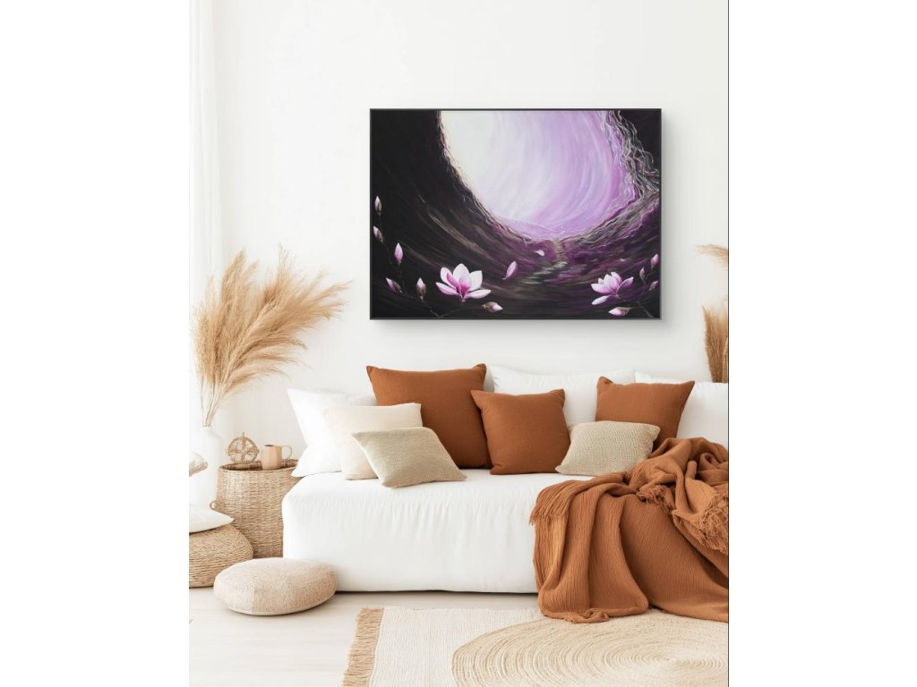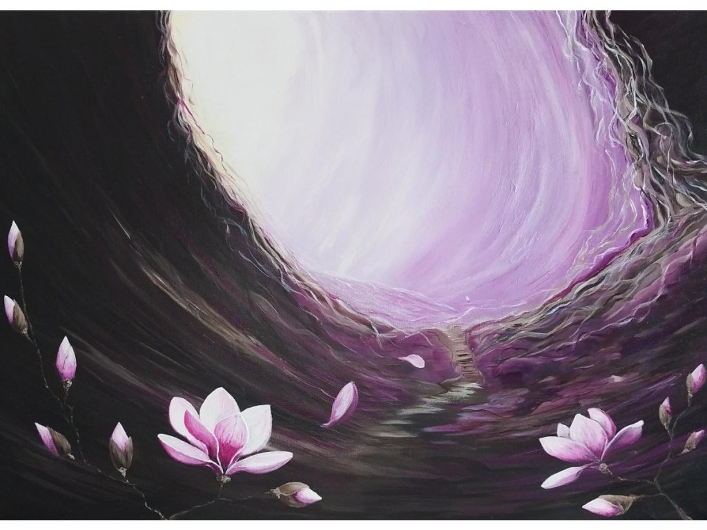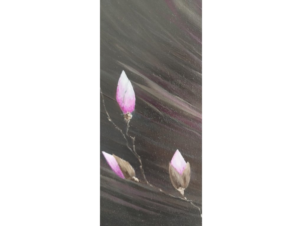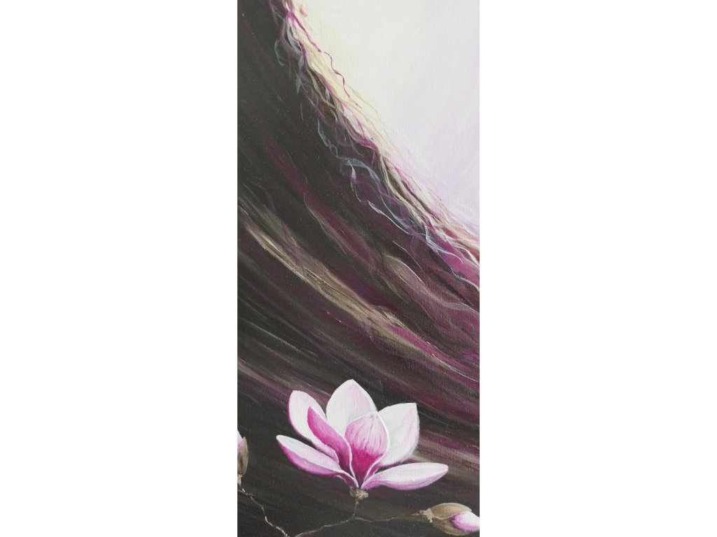 Realistické květy magnólie ve spodní části obrazu jsou symbolem křehkosti i síly.